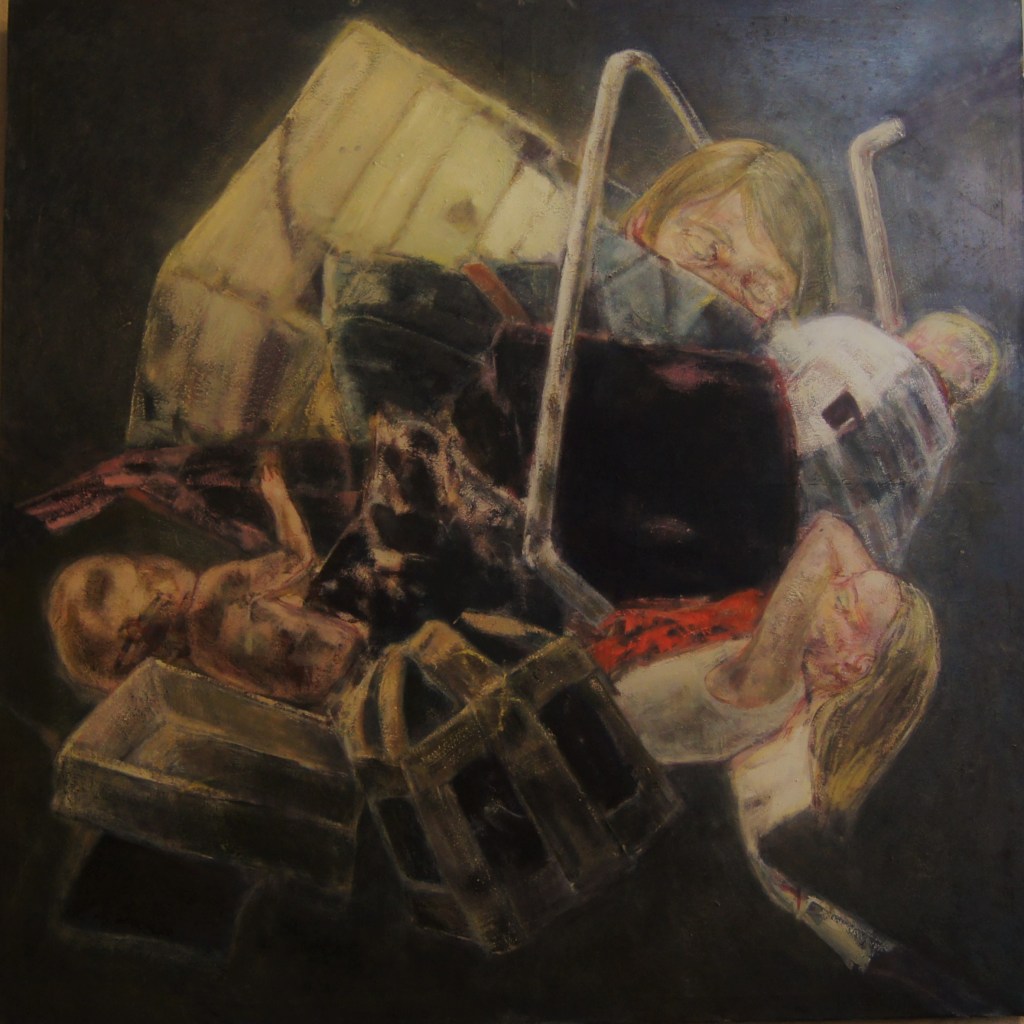 Das Gemälde von Karin Christiansen zeigt einen menschlichen Reflex und Überlebensversuch: eine Mutter mit mehreren Töchtern, die zu Puppen erstarrt sind, schläft in einem Nest aus Möbeln und Müll. Sie liegen zusammengerollt und imitieren Geborgenheit. Denn eine wirkliche Geborgenheit, das Nest, die Wärme, den Schutz, kann es im kalten, leeren Raum nicht geben. Die Trümmer, Ruinen und Reste zeigen vielmehr, wo das vermeintliche Nest sich befindet. Es ist irgendwo im Krieg, in jedem Krieg. Im Krieg zerbersten die Zitadellen, stürzen die Kirchtürme und verlieren sich die Menschen im leeren Raum. In jedem Krieg sind die Kinder die bedauernswertesten Opfer: durch Ostpreußen huschten die verhungerten und verwaisten Wolfskinder, in Afrika – so einige Bilder von Christiansen – werden Kinder als billige und willige Soldaten missbraucht. Aber waren nicht auch die Hitlerjungen missbrauchte Kindersoldaten? Putin lässt ukrainische Kinder stehlen, um der russischen demografischen Katastrophe aufzuhelfen. Selbst dieses grausige Detail hat er Hitler und Himmler abgeschaut.