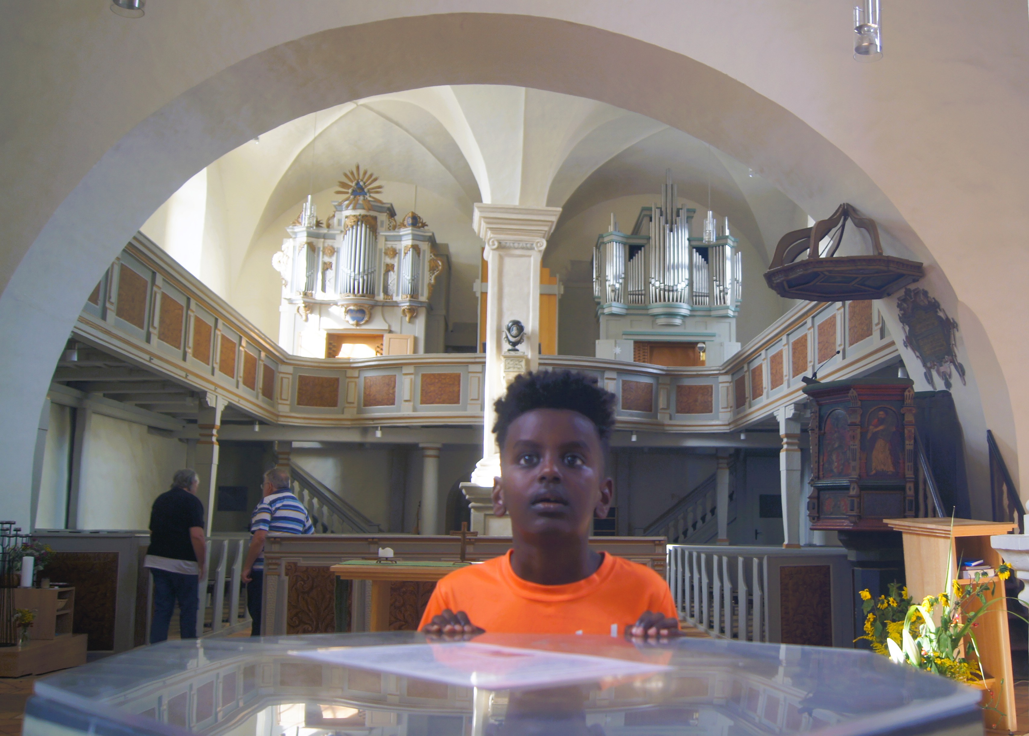 Es war am achten September 2018 in einer Neubaukirche in Berlin, vor uns die riesigen Plattenbauten, die so typisch für die DDR sind, hinter uns eine Einfamilienhaus-Siedlung, die es in vierzig Jahren ihrer Existenz nicht geschafft hat, ihre Straßen mit Namen zu versehen. Ich saß ziemlich in der letzten Reihe mit dem freundlichen katholischen Priester, der seine Kirche der koptischen Tewahedo-Gemeinde zur Verfügung gestellt hatte. Dieser Gottesdienst musste vor dem eigentlichen, katholischen, also sehr früh stattfinden. Wir redeten über die Taufe, über die unsäglichen Maurertuppen[7], in die die Babys getaucht wurden, über Gott und die Welt. Plötzlich stellte sich heraus, dass der Pate noch nicht da war. Ich wurde also gebeten, draußen nach ihm Ausschau zu halten. Ich ging auf die hybride Straße, da Einfamilienidylle, dort Plattenbauten, in der DDR auch Arbeiterschließfächer genannt. Da es Sonntag und vor 7.00 Uhr war, war die Straße menschenleer, fast gespenstisch, denn Berlin hat vier Millionen Einwohner. Plötzlich kam eine Gruppe von über fünfzig Äthiopiern vom S-Bahnhof. Alle grüßten mich, einige umarmten mich, der Pate war schnell herausgefunden. Die Taufe konnte vollzogen, der Taufpate benannt und beauftragt werden. Ein Chor mit Trommeln trat auf, alle hatten festliche rituelle Kleidung an. Frauen und Männer saßen getrennt, aber die Kinder liefen herum. Die Priester und ihre Helfer instruierten die Mütter und die Paten. Nach dem sehr langen Gottesdienst wurde auf dem Hof der Kirche das frisch gebackene Brot – himbasha – gebrochen, wie es in der Bibel heißt und rituell gegessen. Sieben Babys waren in die Menschengemeinschaft aufgenommen worden.
